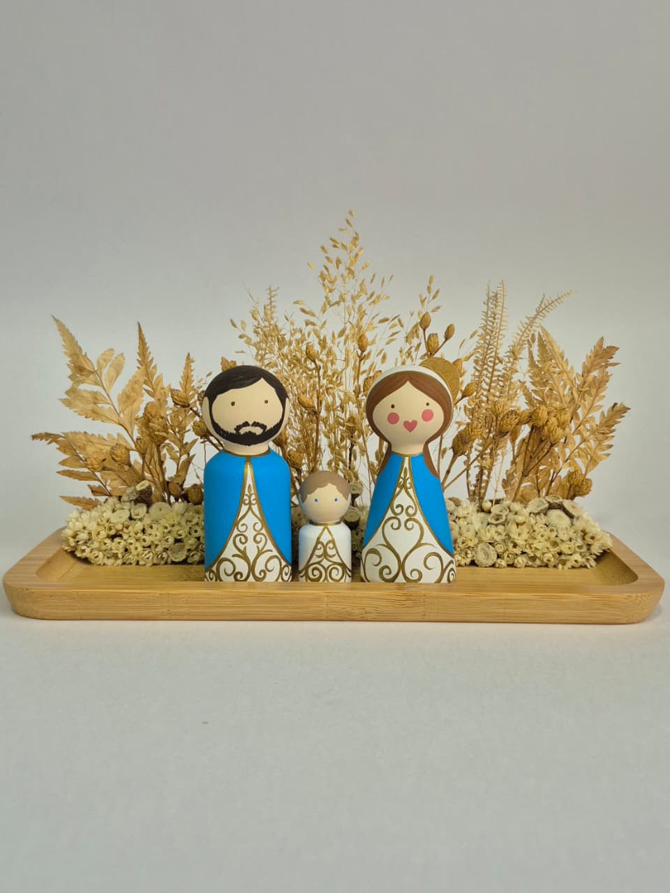 Bandeja em Bambu 10x26 + Flores secas + Sagrada Família em madeira pintada a mão.