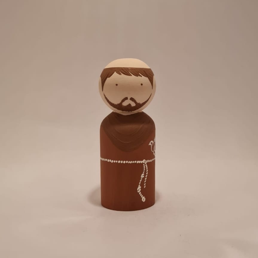 Boneco personalizado em madeira maciça pintado a mão, altura 12cm, diâmetro 4,5cm.