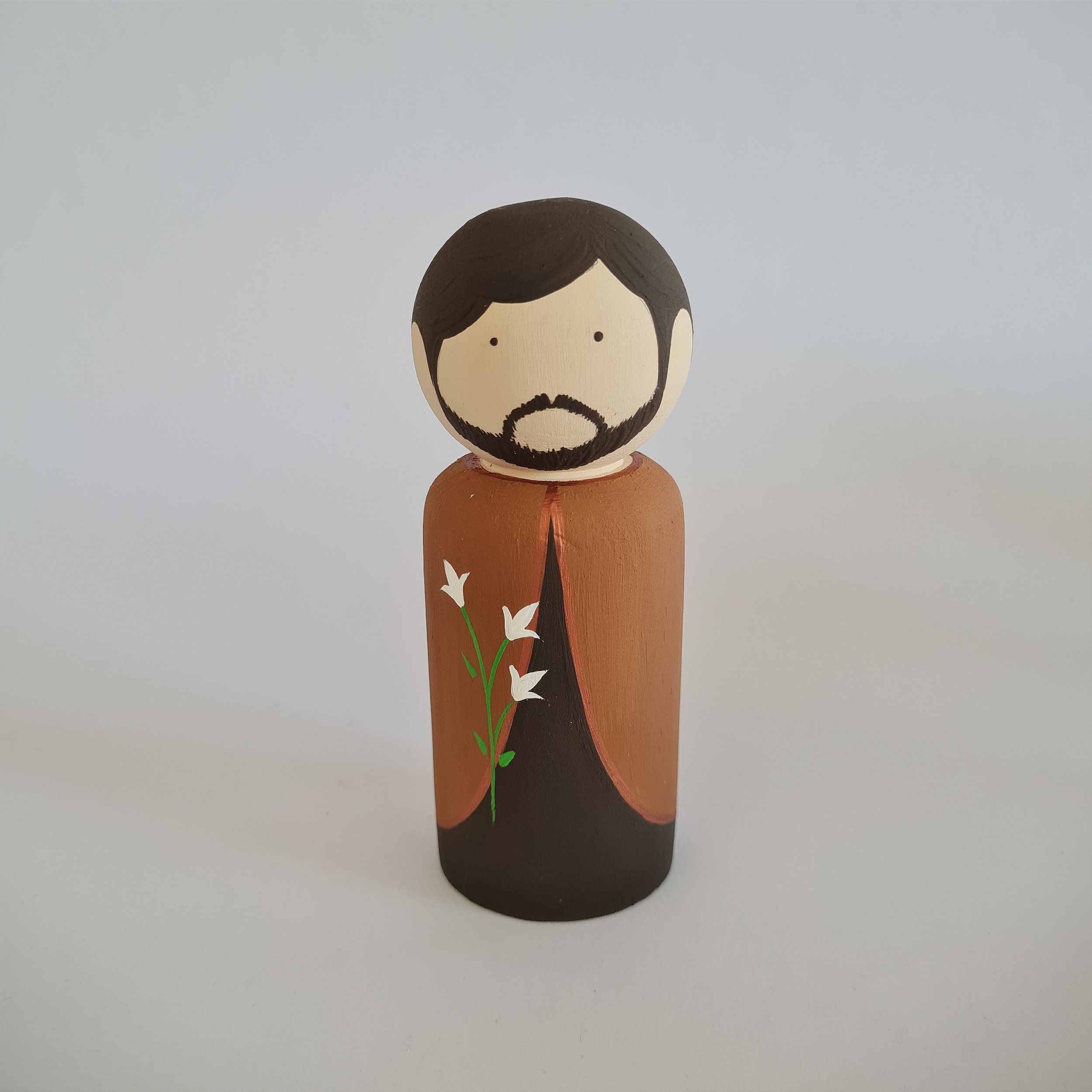Boneco personalizado em madeira maciça pintado a mão, altura 12cm, diâmetro 4,5cm.